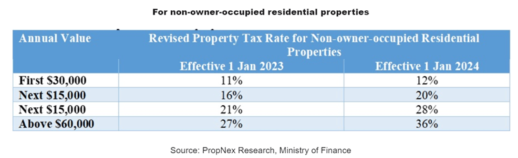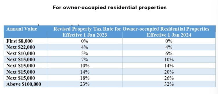 The property tax rates for owner- occupied Singapore properties for the segment of yearly value more than $30,000 will be raised from 4% to 16% presently, 6% to 32%. And tax rates for non-owner-occupied residential Singapore properties, will increase from 10% to 20% currently, to 12% to 36%.