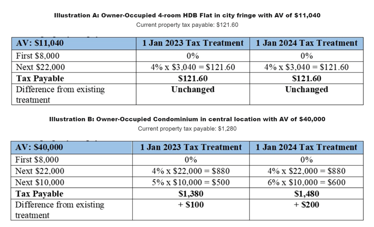 Meanwhile there is a non-occupied condo in the suburbs with an annual value of $30,000 will be a raise of $600 in Singapore property tax payable to $3,600 from 2024 (See Illustration E).