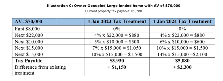 Eventually, a property owner who is living in a large sized landed Singapore property will have to fork out more on property tax after the revision, with tax payable increasing from the current $2,780 to $3,930 in 2023 and to $5,080 in 2024 (See Illustration C).